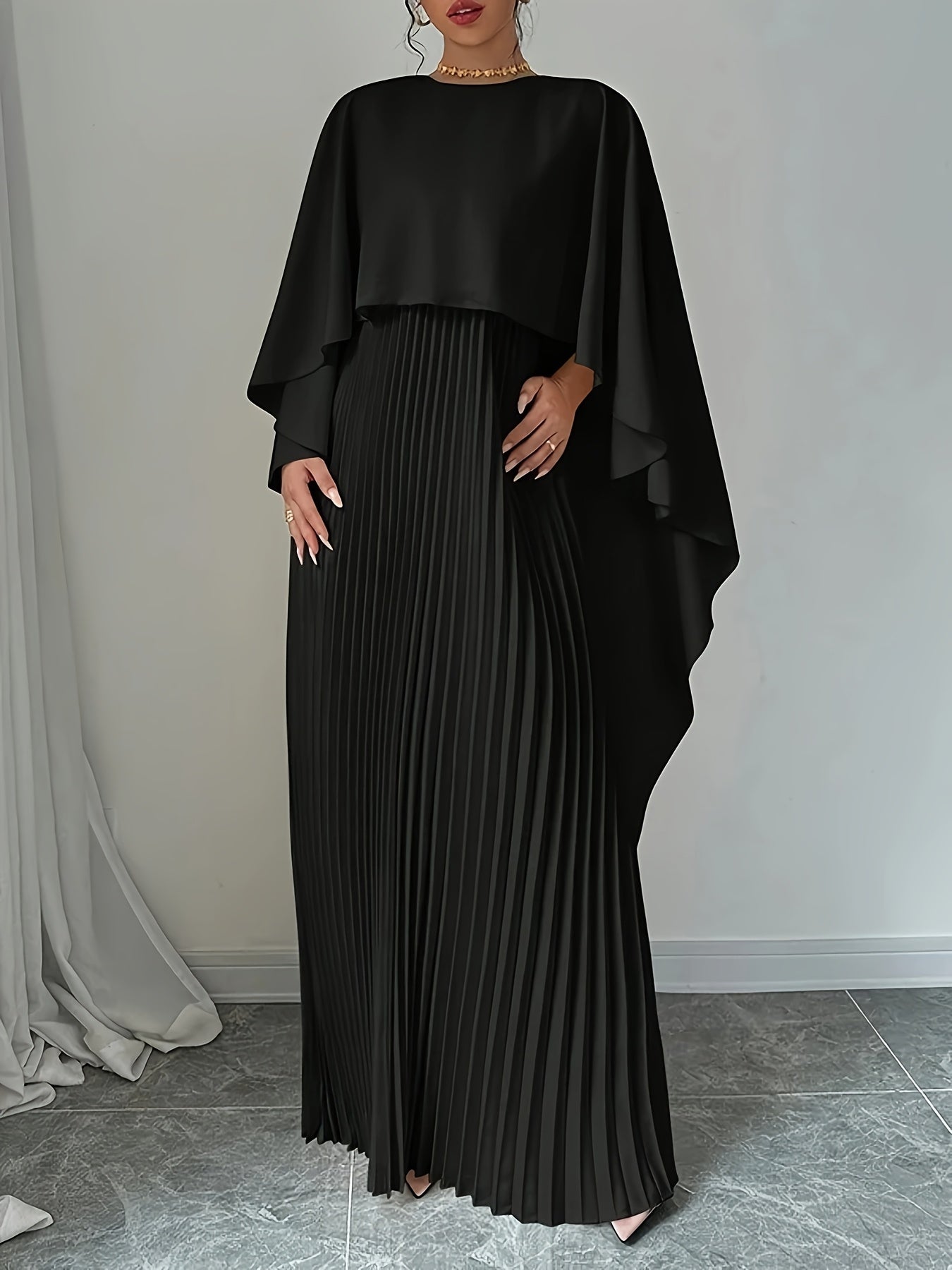 - Design: Cape overlay, pleated skirt, round neck, maxi length