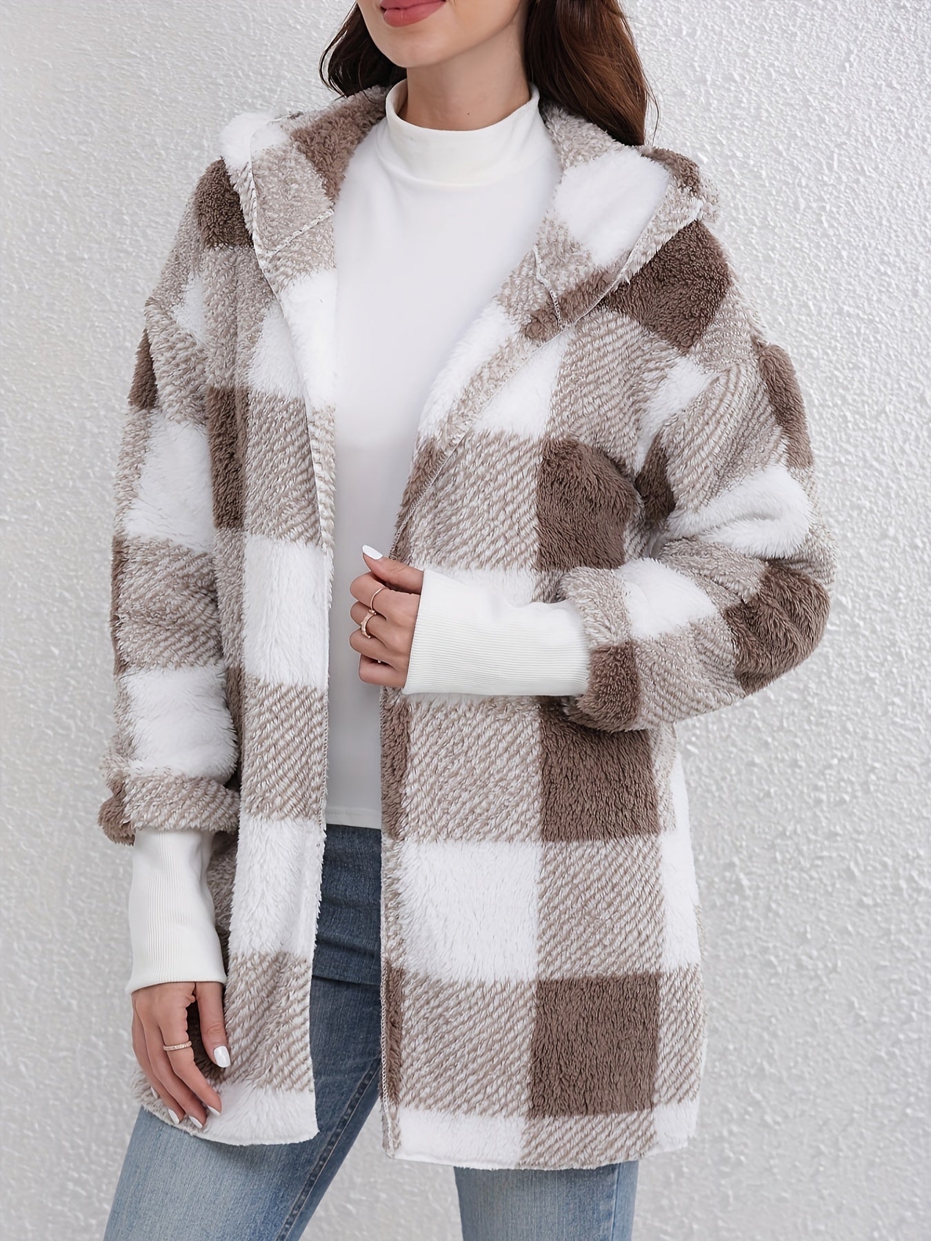 Embrace warmth and style with this cozy plaid hooded jacket. Featuring an open-front design and long sleeves, it's the perfect layer for chilly days. The soft, plush texture adds comfort, while the classic plaid pattern brings a trendy edge to your wardrobe. Ideal for casual outings, this jacket pairs effortlessly with jeans and boots for a chic cold-weather look.