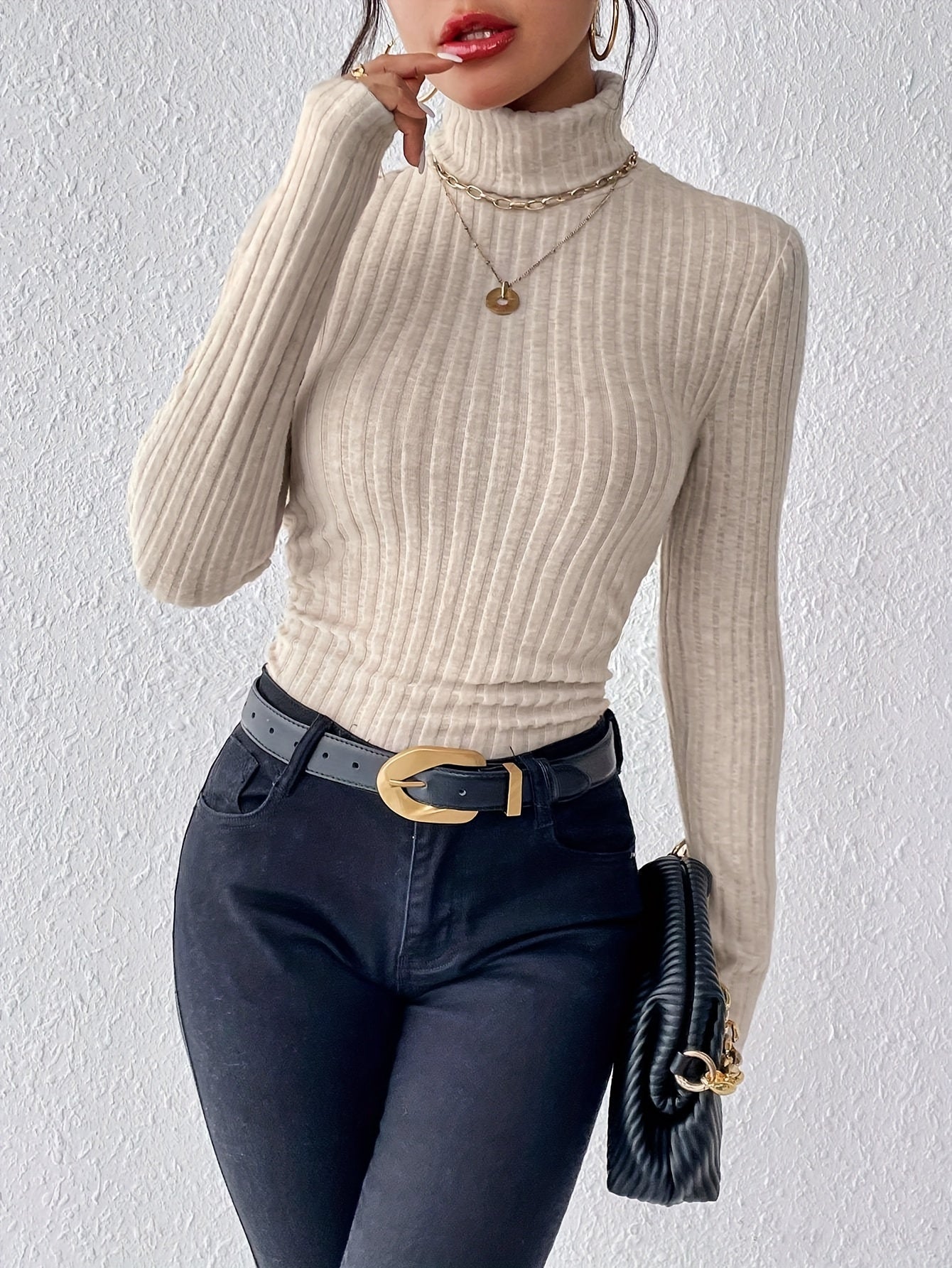 Stay cozy and stylish with this ribbed turtleneck top, a must-have for any wardrobe. The fitted silhouette and stretchy ribbed fabric provide a flattering and comfortable fit, perfect for layering or wearing on its own. Ideal for casual outings, office wear, or chilly days, this versatile piece pairs effortlessly with jeans, skirts, or trousers. Elevate your look by adding your favorite accessories for a polished finish.