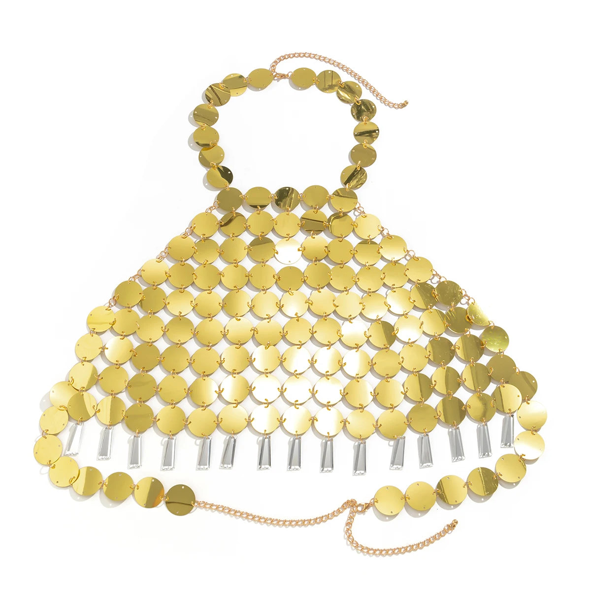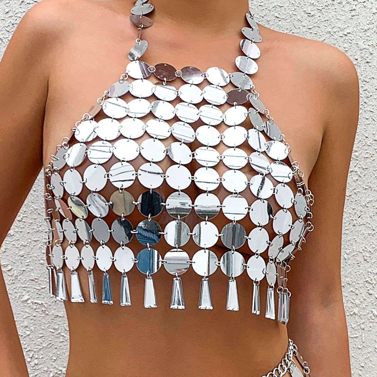 Make a striking statement with this blue metallic sequin halter top, perfect for festivals, beach parties, or daring night-out looks. The bold circular sequins reflect light beautifully, while the dangling silver accents add extra flair to the already eye-catching design. Pair this show-stopping top with jeans, shorts, or a skirt for a fun and fearless style that guarantees all eyes on you. Lightweight and comfortable, this top is the ultimate piece for a standout look at any summer event.