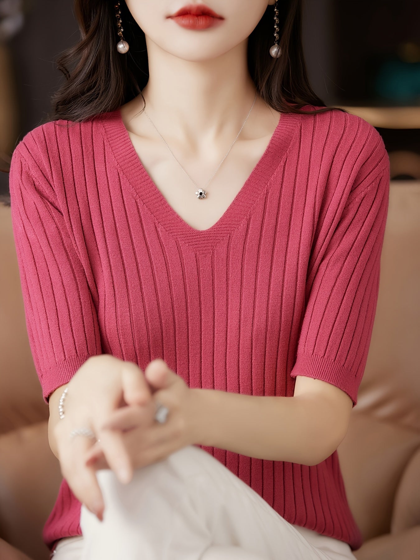 Upgrade your wardrobe with this stylish ribbed knit v-neck top, designed with short sleeves and a flattering slim fit. Perfect for casual outings, workdays, or relaxing at home, this top offers a blend of elegance and comfort. The ribbed texture adds a touch of sophistication, making it versatile for pairing with jeans, skirts, or trousers. Ideal for spring, summer, and autumn, this timeless piece is a must-have for effortless style.