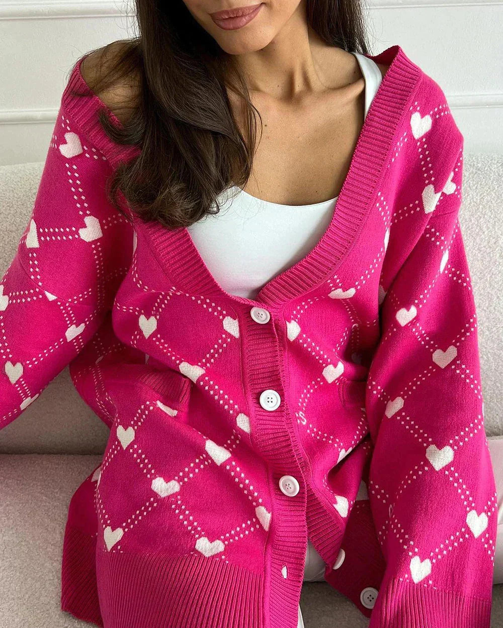 Wrap yourself in warmth and charm with this delightful knitted jacquard cardigan, featuring an adorable heart print and stylish button details. Perfect for layering over your favorite outfits, it adds a playful touch to your wardrobe while keeping you cozy all season long!