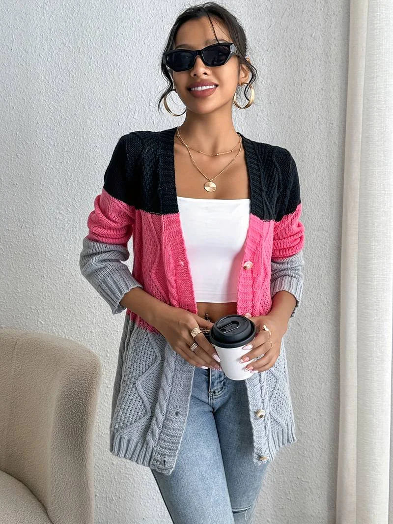 Add a splash of color to your fall wardrobe with this cozy contrast color cardigan. Designed with a casual fit and charming button details, this piece will effortlessly elevate your style while keeping you warm. Pair it with jeans or leggings for an easy, on-trend look perfect for cooler days!