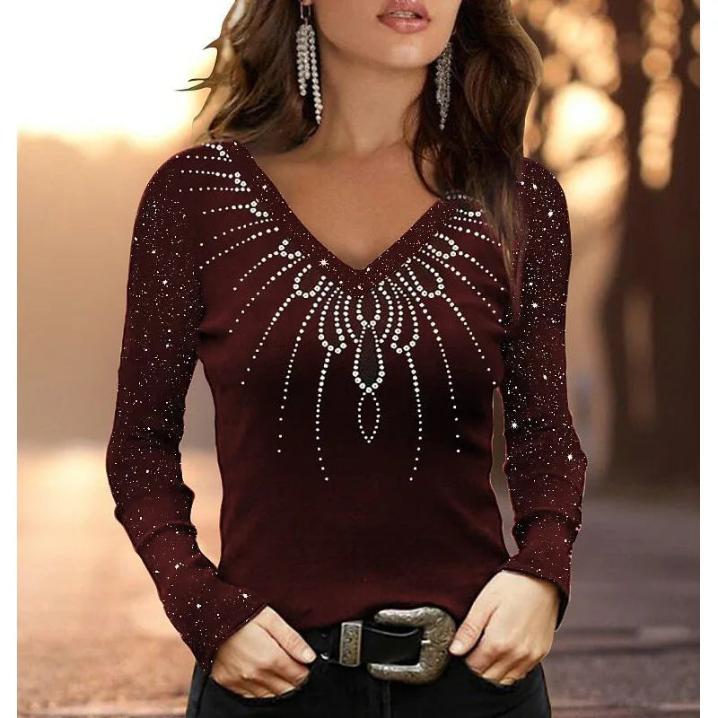 This stylish women's V-neck T-shirt is the ideal choice for casual outings and daily wear. Featuring a slim fit design and geometric patterns, it combines both comfort and fashion in one piece. The long sleeves make it perfect for layering, while the V-neck collar adds a touch of elegance to your everyday look. Whether you're relaxing at home or heading out with friends, this T-shirt is a versatile wardrobe essential.