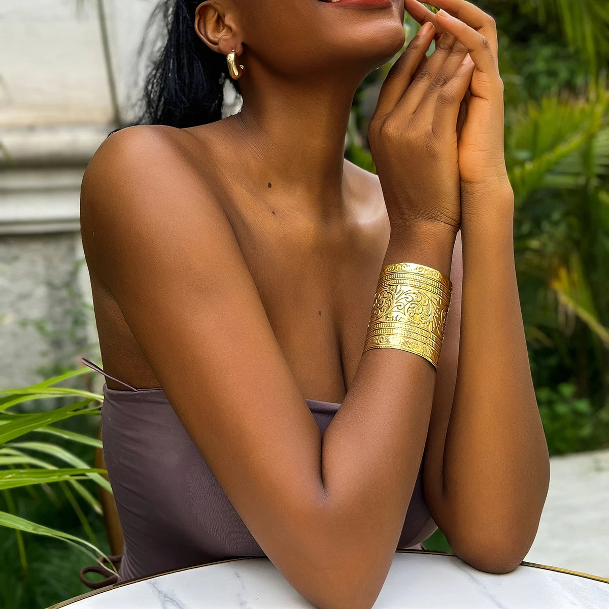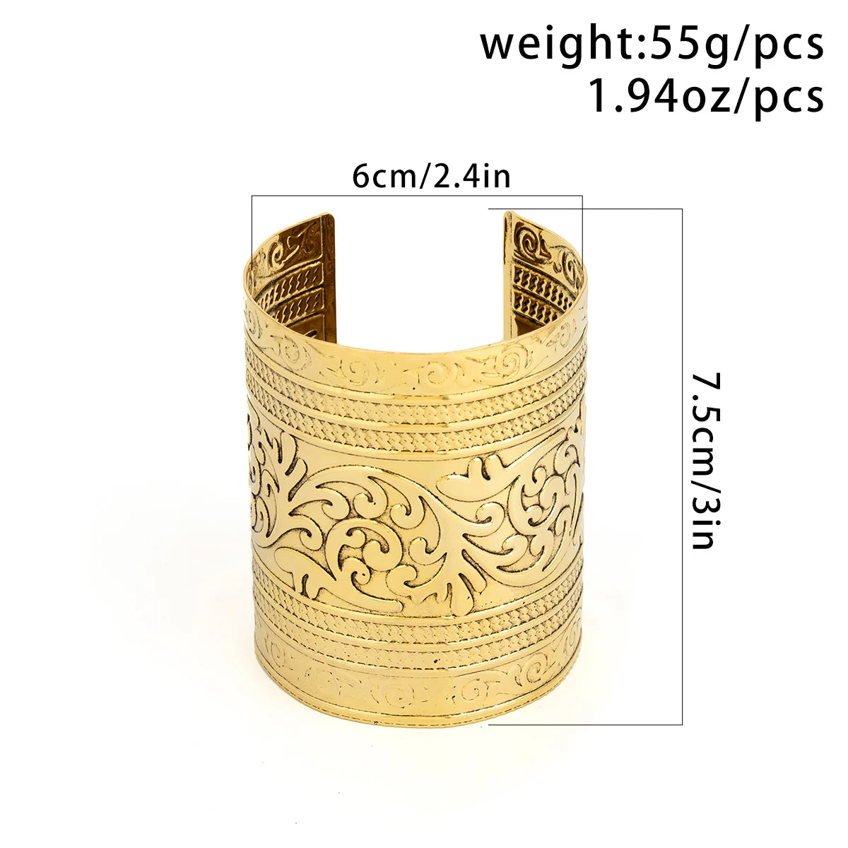 Featuring intricate carving patterns that exude edgy sophistication. Designed for women who love bold accessories, these exaggerated chunky arm bracelets add a unique touch to any outfit. Perfect for layering or wearing solo, they effortlessly elevate both casual and formal looks. Embrace your individuality and showcase your style with these standout bangles that are sure to turn heads.