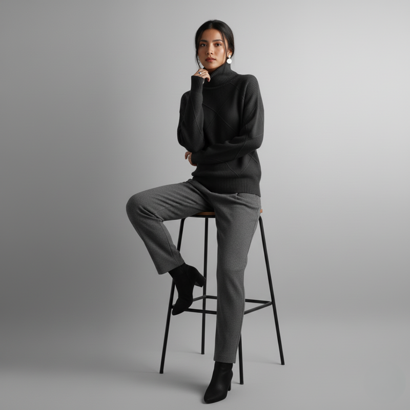 Cozy Turtleneck: Tall ribbed collar seals in warmth with polished structure