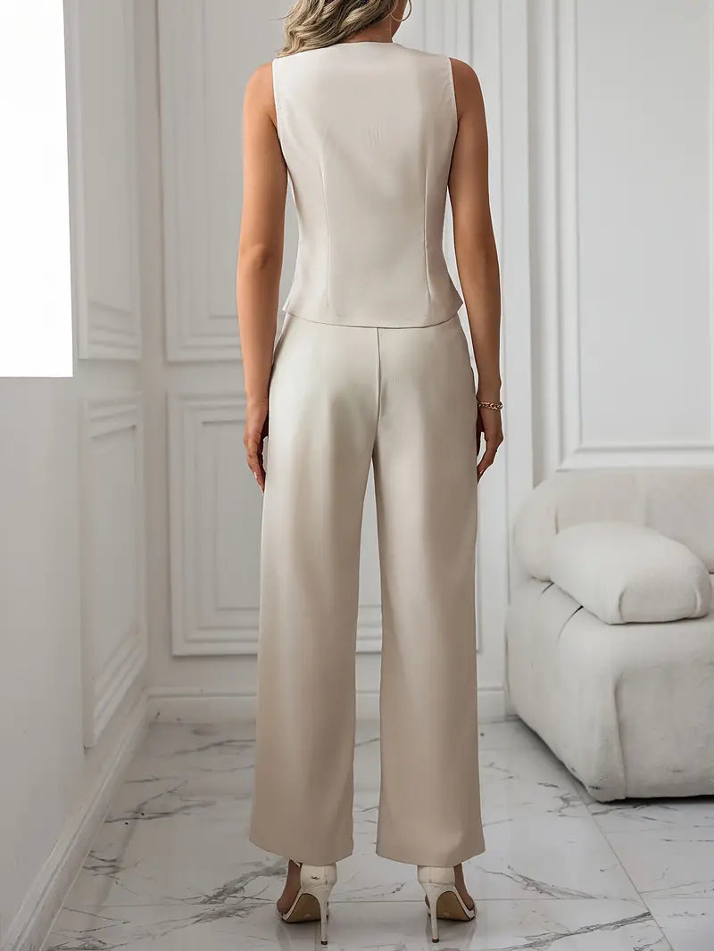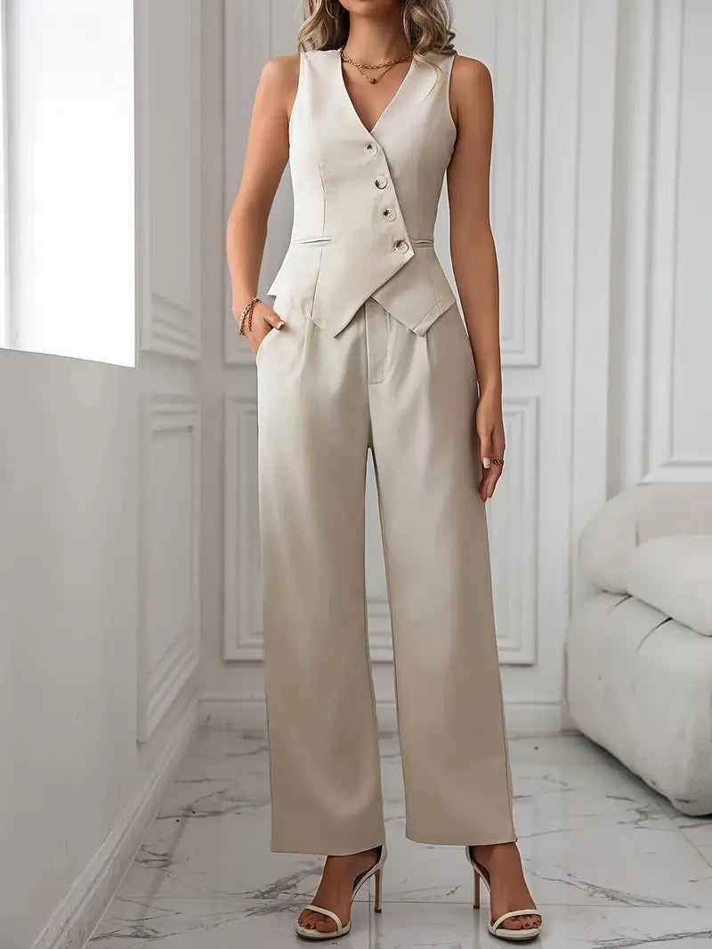 Step into sophistication with this sleek one-piece pantsuit featuring a tailored vest and stylish flare pants. The single-breasted vest adds a touch of elegance, while the flare legs create a flattering, elongated silhouette. Perfect for formal events or a night out, this versatile ensemble will have you turning heads with effortless style.