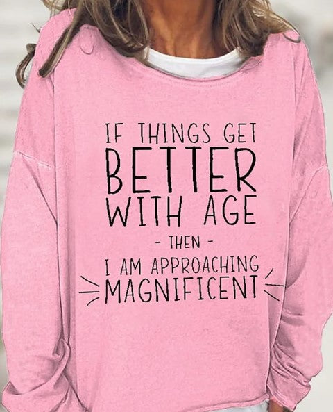 This oversized sweatshirt combines cozy comfort with a playful message, perfect for those who embrace aging with confidence. The bold graphic reads, "If things get better with age, then I am approaching magnificent," adding a lighthearted twist to your casual wear. Crafted from soft, breathable fabric, this sweatshirt is ideal for relaxed days at home or out and about. Make a statement effortlessly while staying comfortable and stylish.