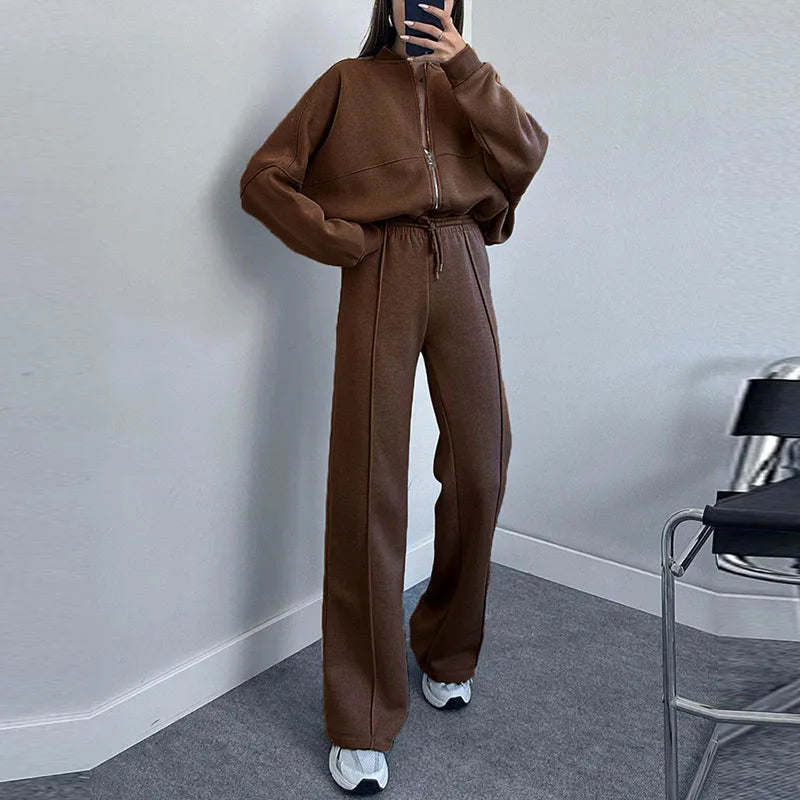 This relaxed-fit zip-up tracksuit set is your go-to for effortless loungewear or casual outings. Featuring a high-neck zip-up top and wide-leg pants with an elastic waist, it offers both comfort and a stylish silhouette. Perfect for running errands or lounging at home, this versatile set ensures you stay cozy without compromising style.